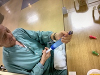 利用者様が手編みの膝掛けを完成し、そっと他の利用者に掛けてあげる優しい一コマがありました。台風が近づく不安の中ですが今日も笑顔と元気をいただきました。