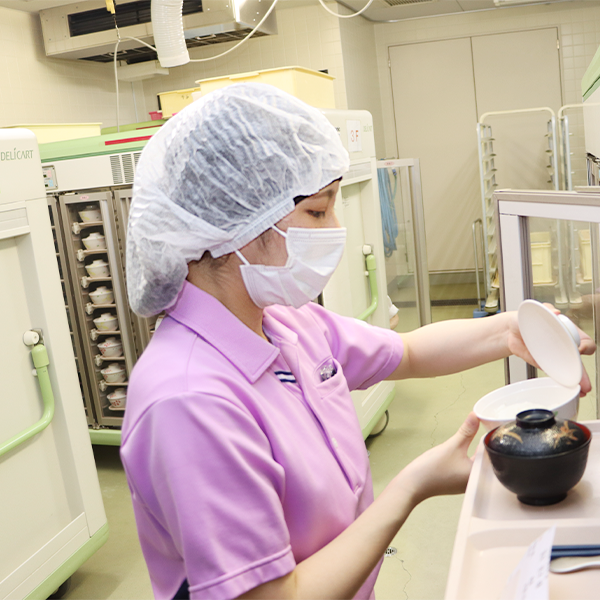 「フードサービス」と「クリニカルサービス」の両立、医療スタッフの一員として、疾病治療に貢献することを目的に患者さんそれぞれにあった栄養状態の把握と管理、ライフスタイルに合わせた栄養食事指導と安全で美味しい給食の提供を目指します。
